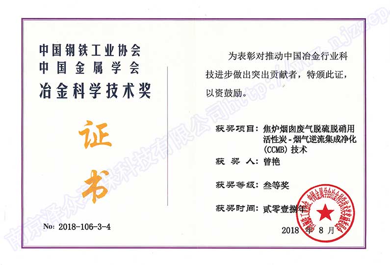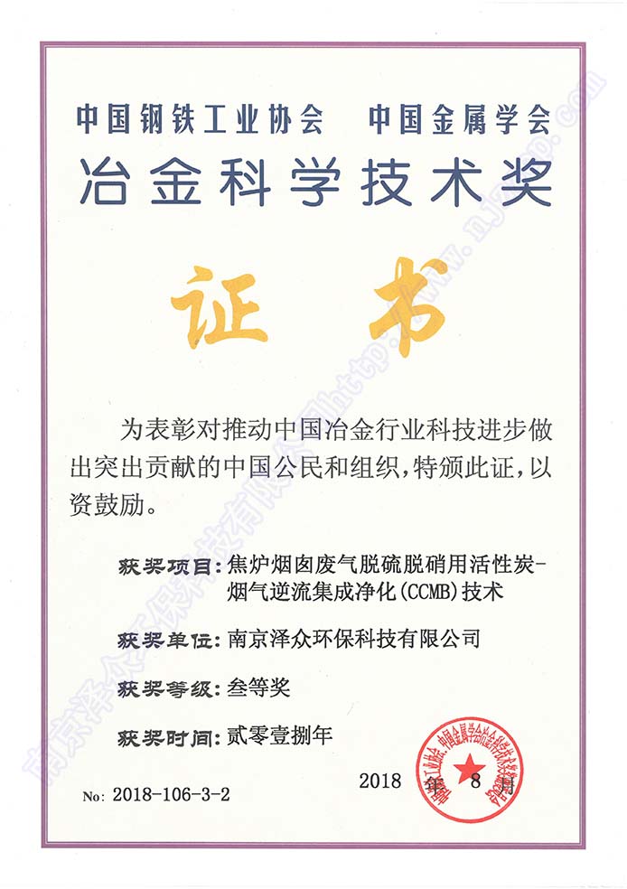 南京澤眾環(huán)保科技有限公司坐落于南京市雨花臺(tái)區(qū),注冊(cè)資本6000萬元,2017年被認(rèn)定為高新技術(shù)企業(yè),2018年被認(rèn)定為瞪羚企業(yè),入選中國(guó)鋼鐵技術(shù)與服務(wù)供應(yīng)商品牌企業(yè),被評(píng)為鋼鐵產(chǎn)業(yè)鏈綠色標(biāo)桿企業(yè),與浙江工業(yè)大學(xué)合作成立聯(lián)合研發(fā)中心,入股河南安鋼澤眾冶金設(shè)計(jì)有限責(zé)任公司,牽頭起草《燒結(jié)煙氣活性焦干法脫硫、脫硝技術(shù)規(guī)范》和《焦?fàn)t煙氣聯(lián)合脫硫脫硝技術(shù)規(guī)范》。